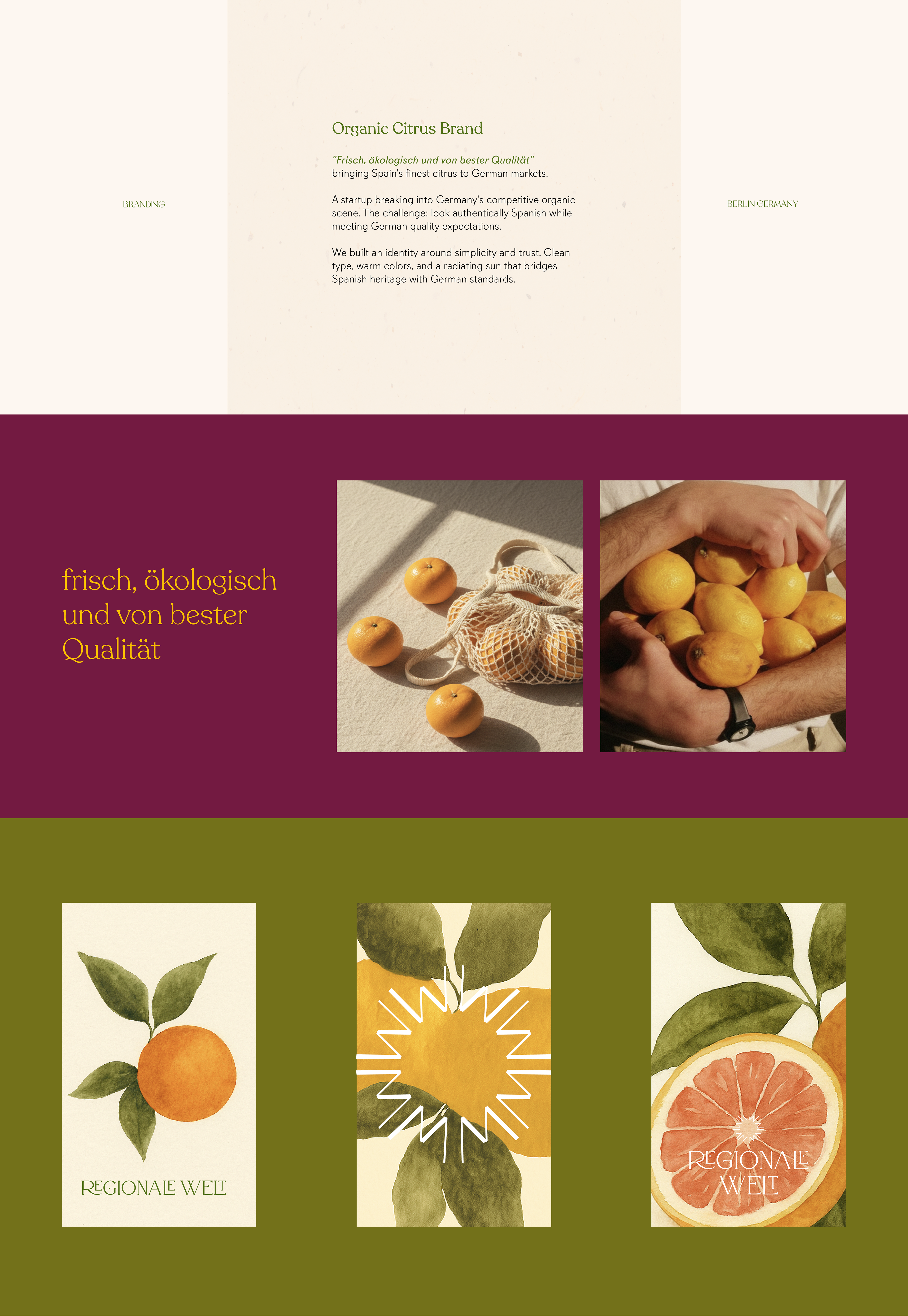 Brand identity for a German organic citrus company bringing Spanish produce to Berlin markets. The visual system balances ecological values with premium quality, featuring clean typography and warm colors that connect Spanish heritage with German standards.